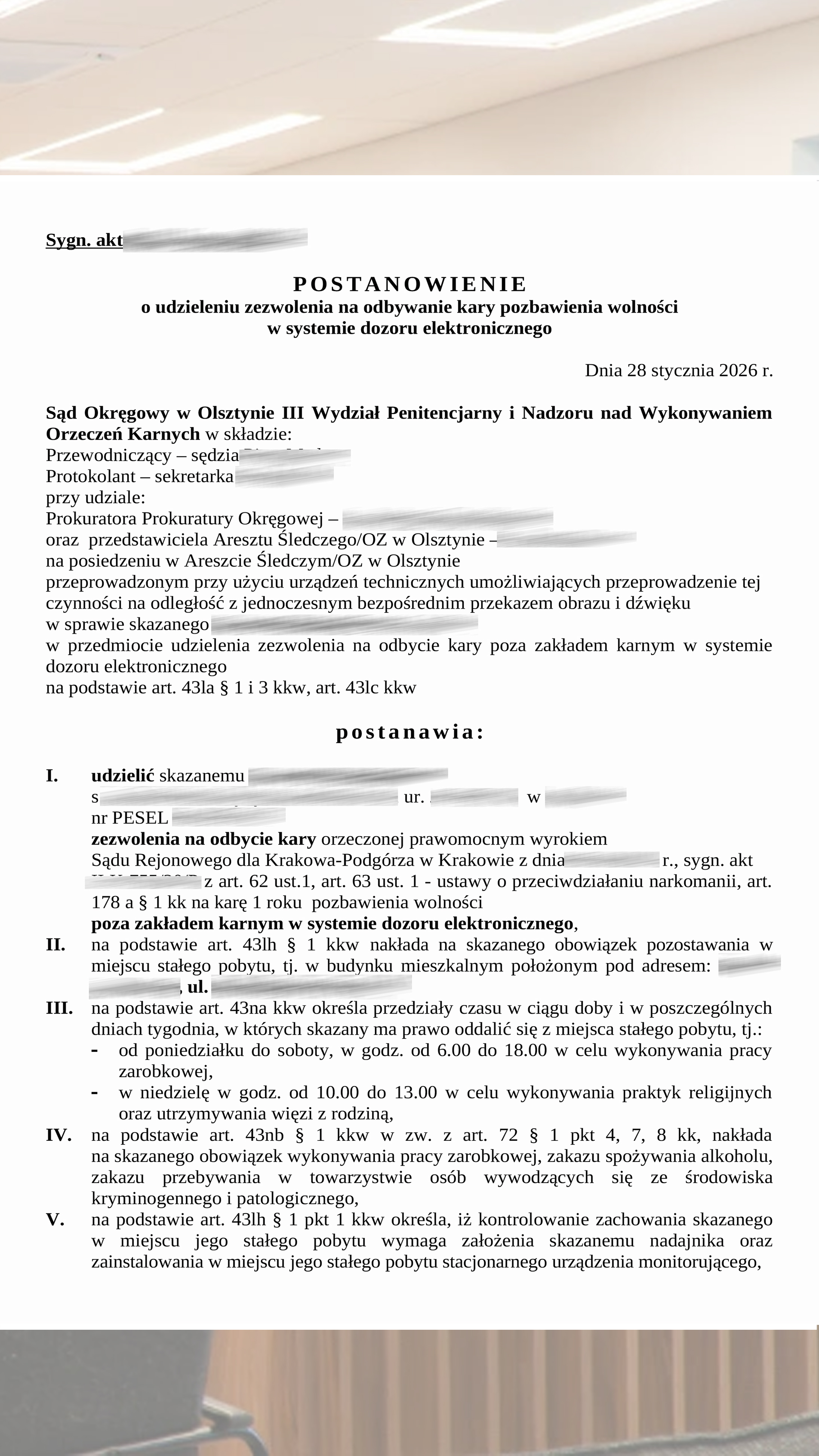Официальное постановление подтверждает изменение места исполнения меры пресечения в виде dozor policji. Это снижает административную нагрузку и повышает исполнимость процессуальных обязанностей.
