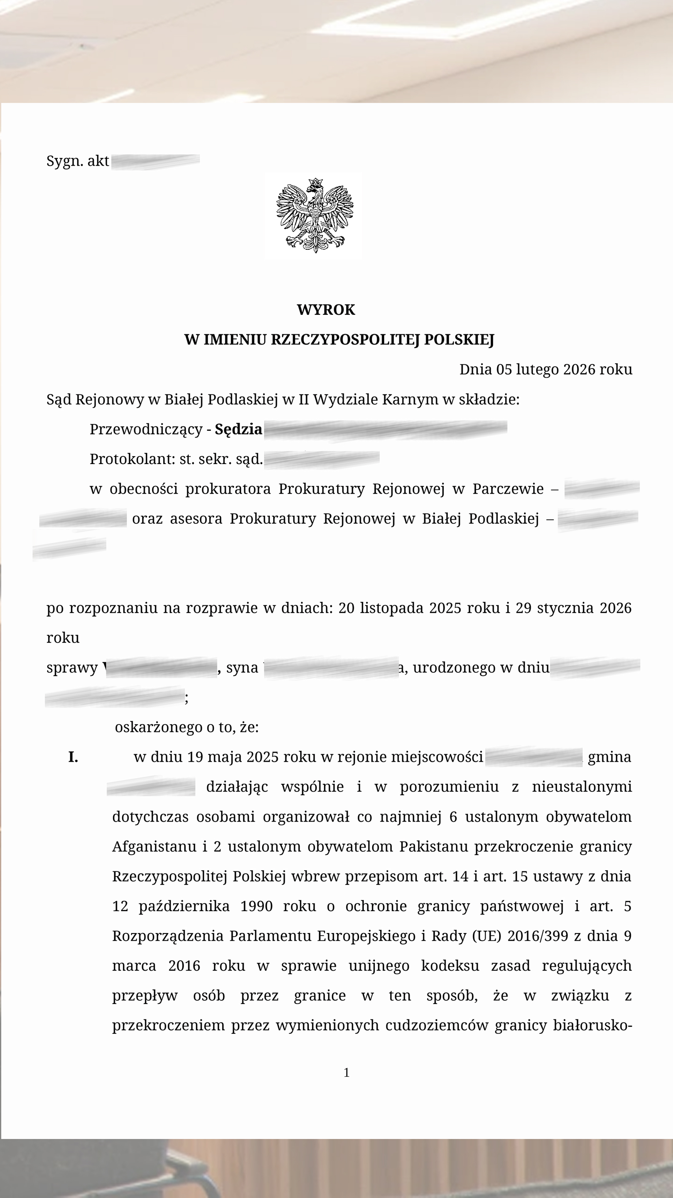 Обезличенный приговор подтверждает судебное рассмотрение эпизода, связанного с организацией незаконного пересечения границы. Материал отражает квалификацию и процессуальную рамку дела.