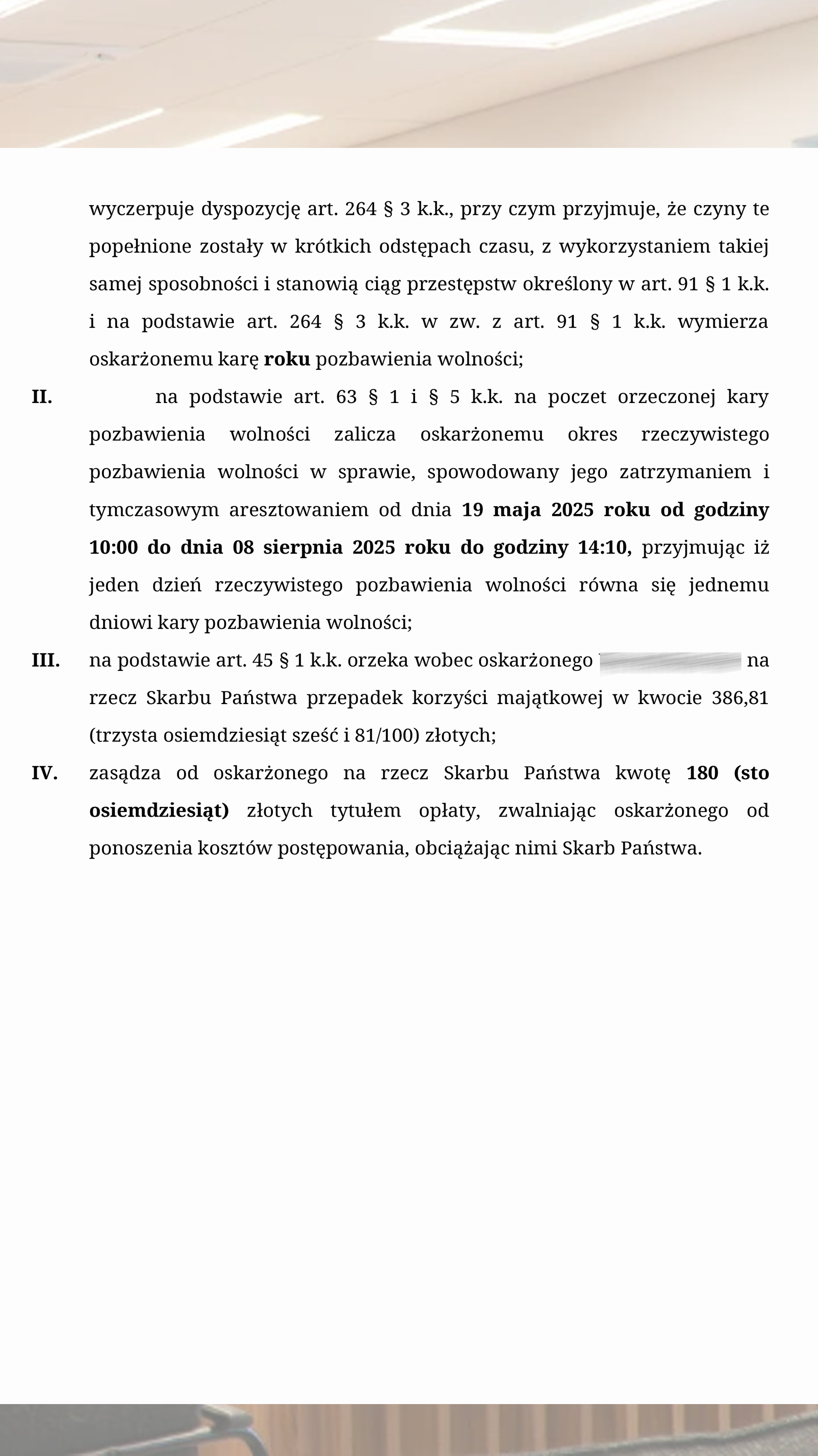 В финальной части решения зафиксированы 50 дневных ставок по 20 zl и сопутствующие процессуальные меры. Реального лишения свободы по данному эпизоду назначено не было.