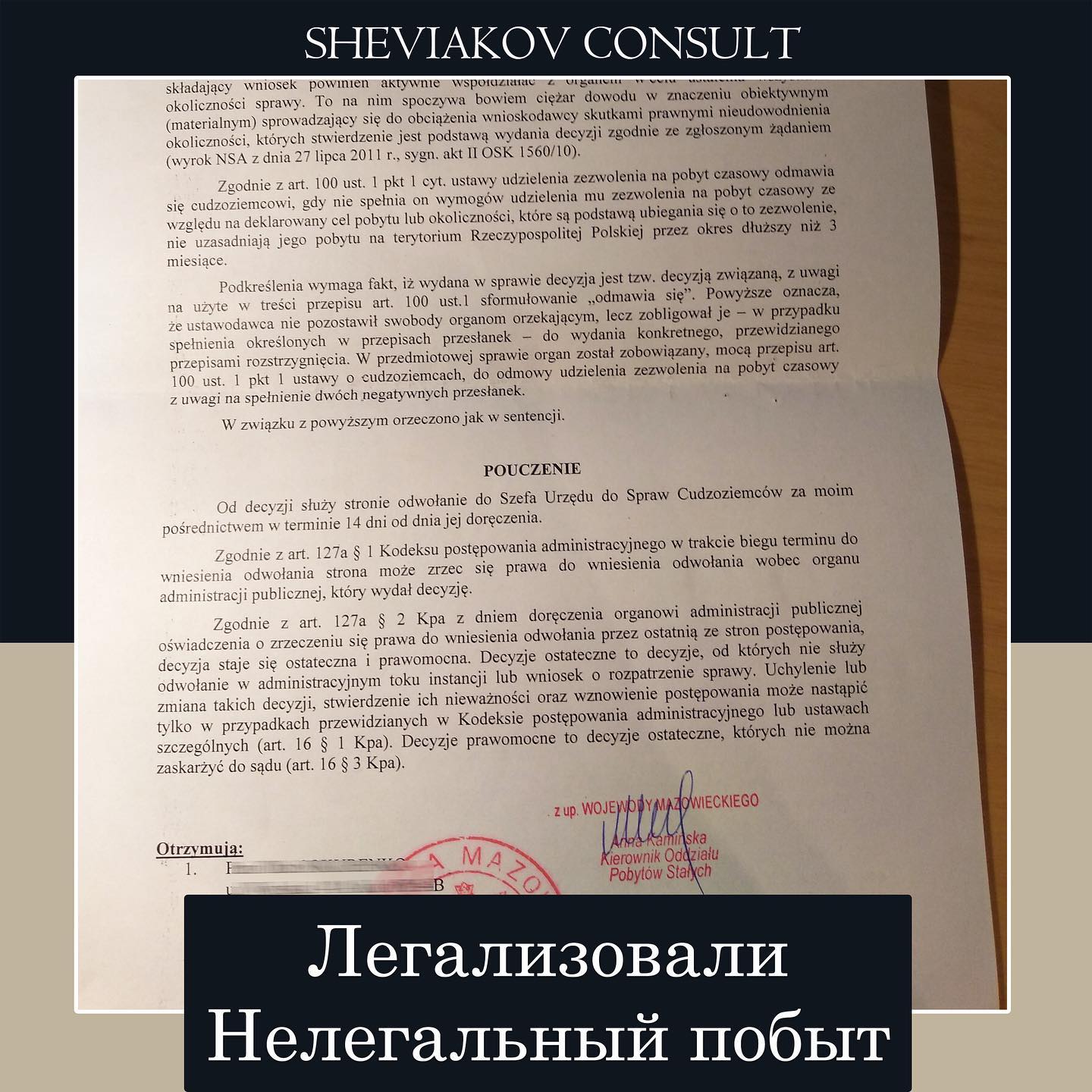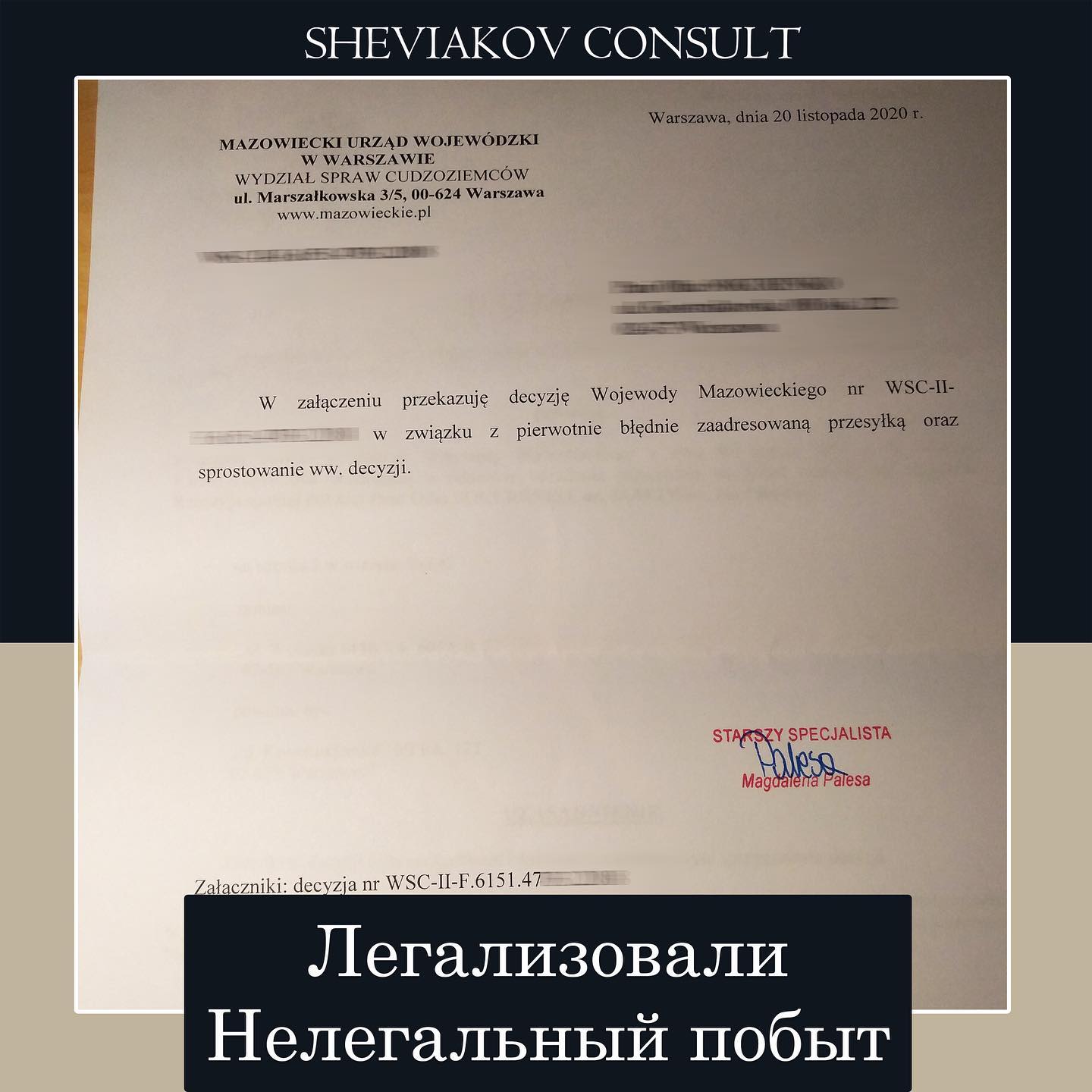В конце октября к нам обратилась девушка в связи с тем, что находилась с 1 марта 2019 года на территории Польши нелегально. Причинои? нелегального побыта была ошибка работника ужонда которыи? отправил отказ по карте на другои? адрес. После получения копии решения девушка пыталась оспорить решение и писать апелляцию еще в 2019 году, но еи? отказали. После ознакомления с документами мы написали заявление do Wojewody Mazowieckiego, а также потребовали выдачу всех материалов по делу (которые нужны для иска в WSA). После получения письма от нас Wojewoda Mazowiecki признал ошибку и аннулировал отказ, которыи? был выдан в марте 2019 года. Теперь от 26.11.2020 пребывания нашеи? клиентки на территории Польши снова считается легальным.