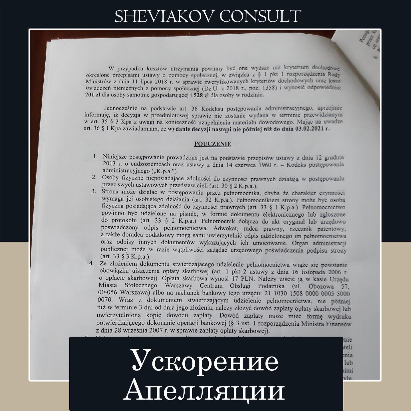 21.11.2020 до нас звернувся іноземець для прискорення видачі рішення щодо апеляції. Szef Urzedu do Sprawy Cudzoziemców протягом 9 місяців не діяв (апеляція була подана 21.02.2020). 25.11.2020 було написано скаргу і вже 04.12.2020 апеляцію було розглянуто, зазначено 5 документів яких не вистачало у справі для видачі позитивного рішення та визнано, що скарга є обґрунтованою. ?
