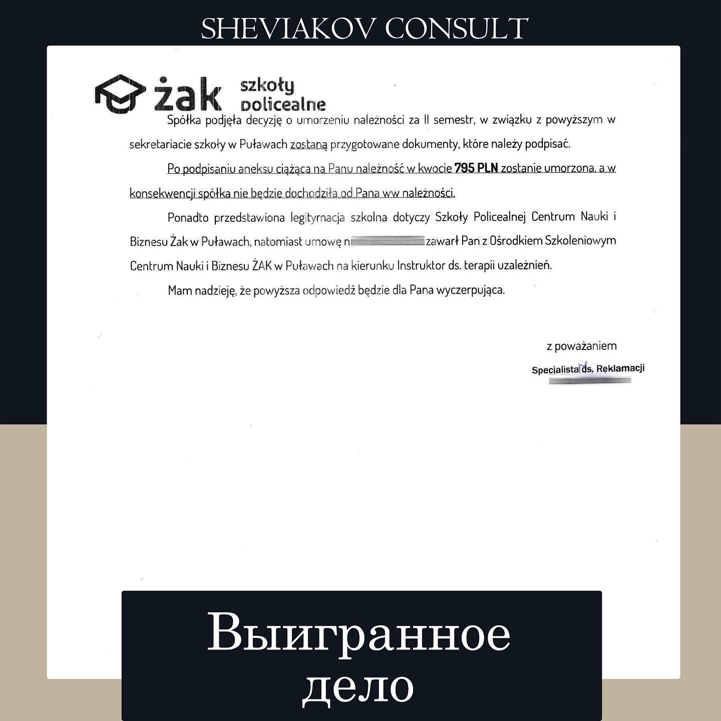 Ознайомившись зі всією ситуацією, ми звернулися з листом до головного офісу школи у місті Lódz з вимогою анулювати заборгованість. Майже через 30 днів ми отримали позитивну відповідь від навчального закладу в якому сказано, що заборгованість успішно анульована. ?