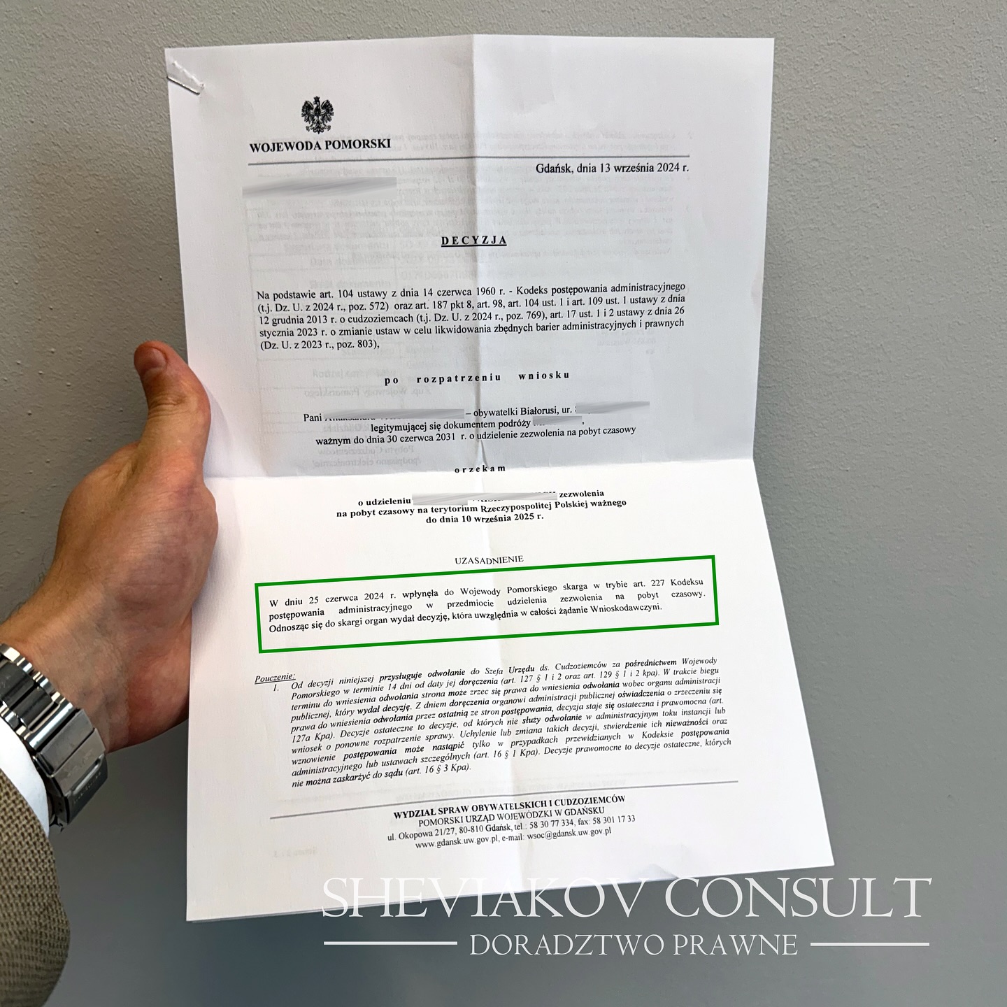 Повідомляємо про позитивне завершення справи нашої клієнтки щодо отримання картки побуту. Натомість стандартного запиту на прискорення ми подали скаргу на бездіяльність органу влади за ст. 227 Кодексу адміністративного провадження. Це дозволило суттєво прискорити процес, і 13 вересня 2024 року Воєвода Поморський ухвалив рішення на користь клієнтки, вказавши, що видача дозволу стала можливою саме завдяки скарзі. Тепер наша клієнтка має право на тимчасове проживання у Польщі до вересня 2025 року.