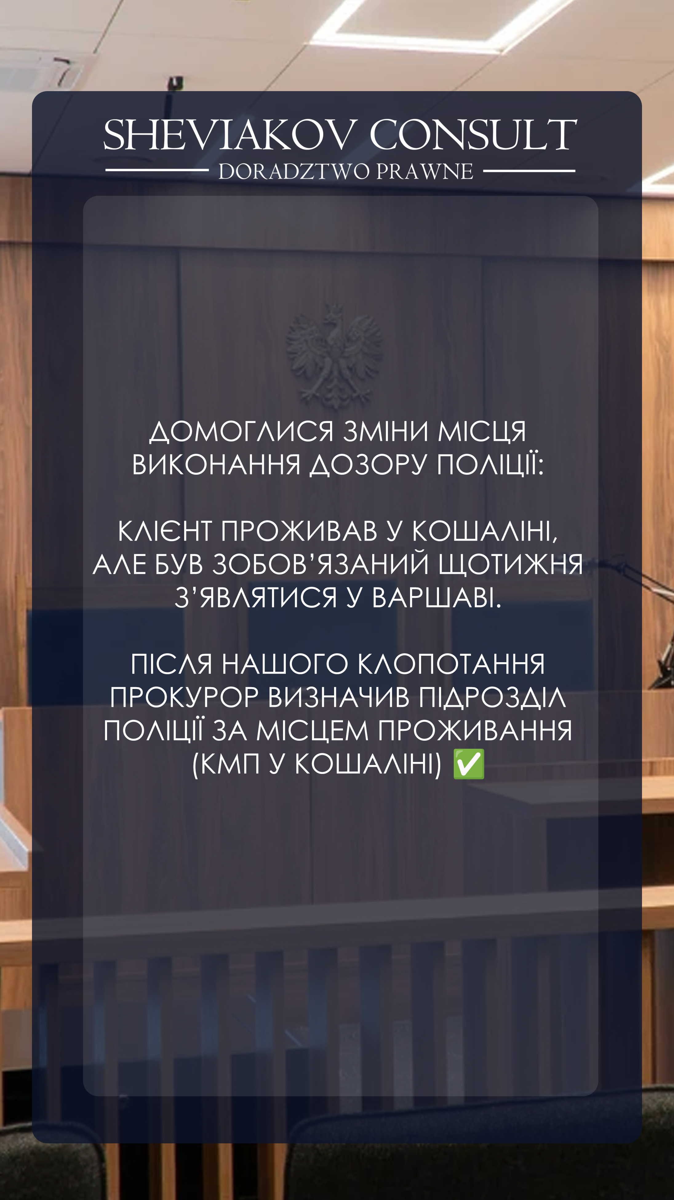 Клиент проживал в Koszalin, но обязан был регулярно отмечаться в Warszawie. После процессуального обращения защита добилась переноса контроля по месту фактического проживания.
