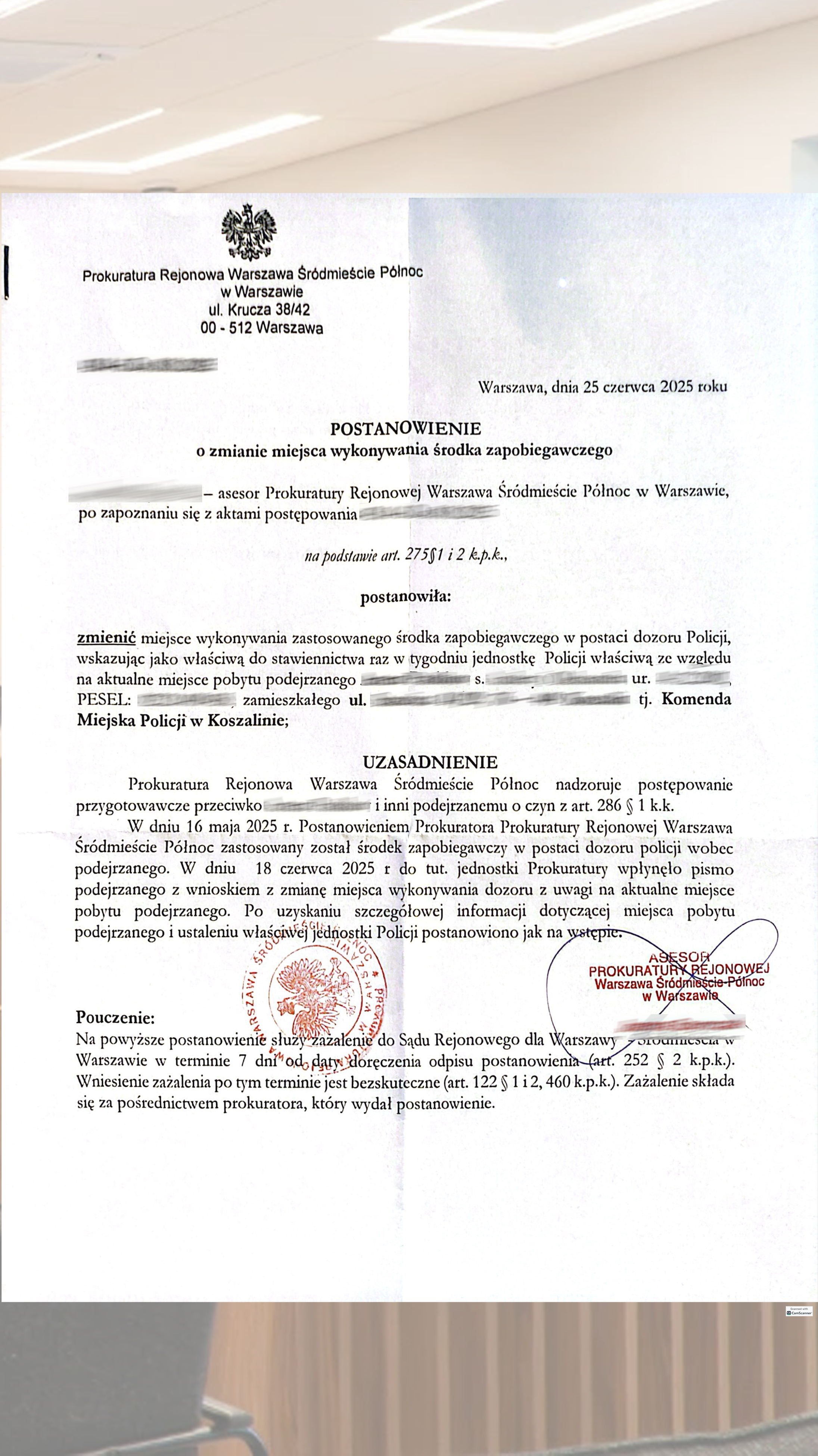 Официальное постановление подтверждает изменение места исполнения меры пресечения в виде dozor policji. Это снижает административную нагрузку и повышает исполнимость процессуальных обязанностей.