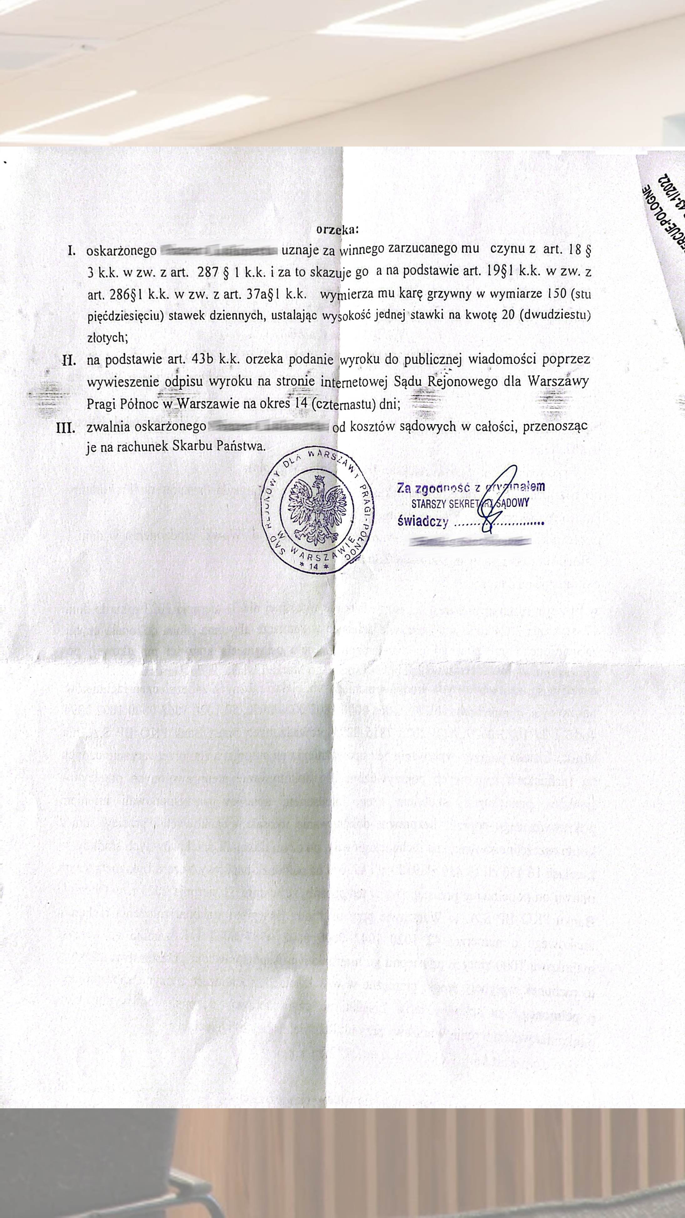 Обезличенный приговор Sad Rejonowy Warszawa Praga-Polnoc подтверждает процессуальный статус и квалификацию эпизода. Материал отражает документальную основу правовой позиции защиты.