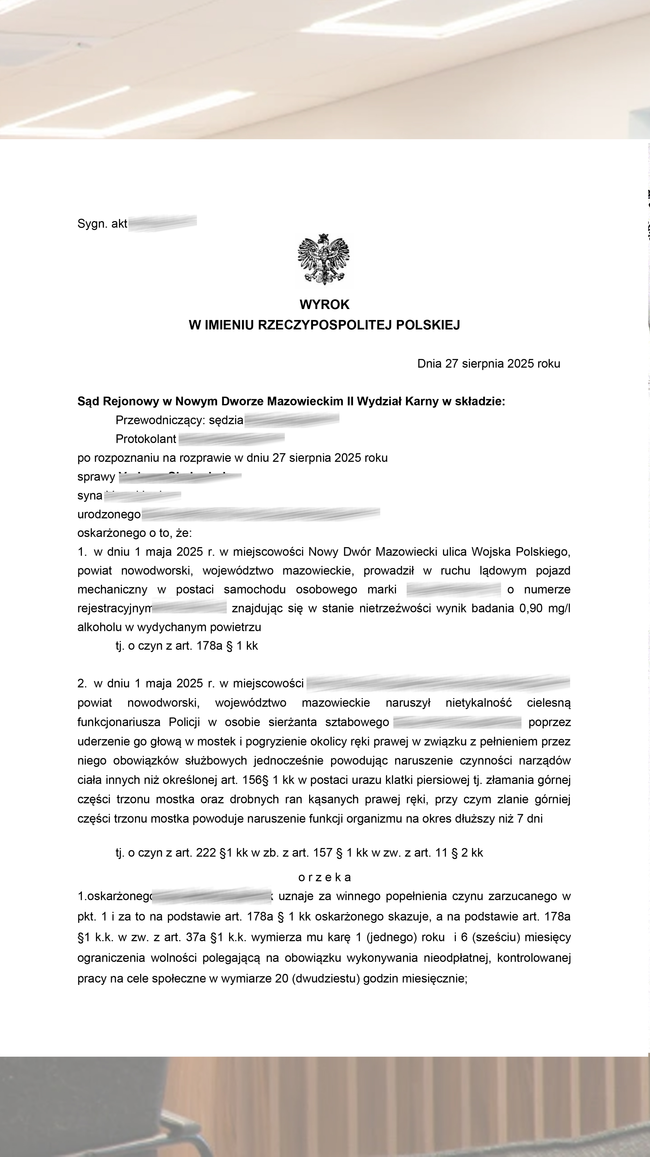 Обезличенный приговор Sad Rejonowy w Nowym Dworze Mazowieckim фиксирует совокупность эпизодов: управление в состоянии опьянения и инкриминированный насильственный компонент. Дело рассматривалось в полноценной судебной процедуре.
