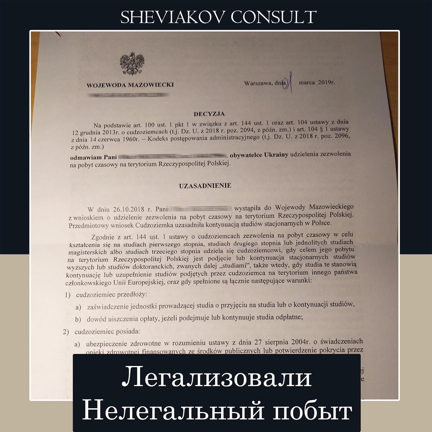 В конце октября к нам обратилась девушка в связи с тем, что находилась с 1 марта 2019 года на территории Польши нелегально. Причинои? нелегального побыта была ошибка работника ужонда которыи? отправил отказ по карте на другои? адрес. После получения копии решения девушка пыталась оспорить решение и писать апелляцию еще в 2019 году, но еи? отказали. После ознакомления с документами мы написали заявление do Wojewody Mazowieckiego, а также потребовали выдачу всех материалов по делу (которые нужны для иска в WSA). После получения письма от нас Wojewoda Mazowiecki признал ошибку и аннулировал отказ, которыи? был выдан в марте 2019 года. Теперь от 26.11.2020 пребывания нашеи? клиентки на территории Польши снова считается легальным.