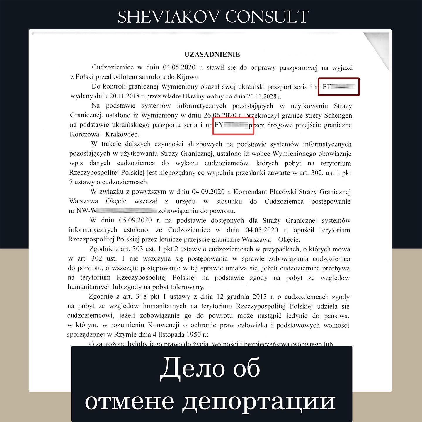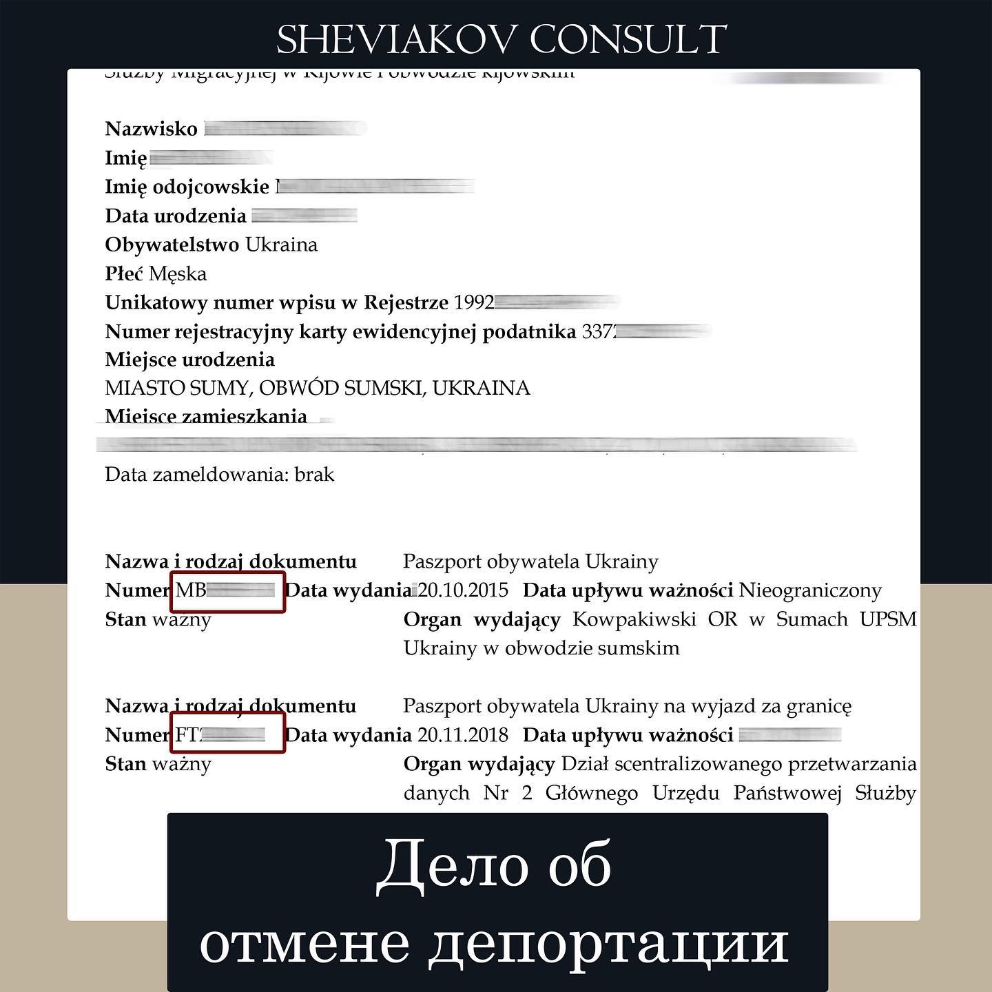 Причиной депортации по заявлению Komendanta Strazy Granicznej Warszawa – Okecie иностранец выезжал 04.05.2020 с территории Польши на основании паспорта с серией FT******, а 26.06.2020 въезжал в Польшу на основании паспорта с серией FY******. В системе Пограничной Службы иностранец с заграничным паспортом серии FY****** числиться как депортированный и по неизвестным причинам Komendant утверждает, что это один и тот же человек с нашим клиентом.